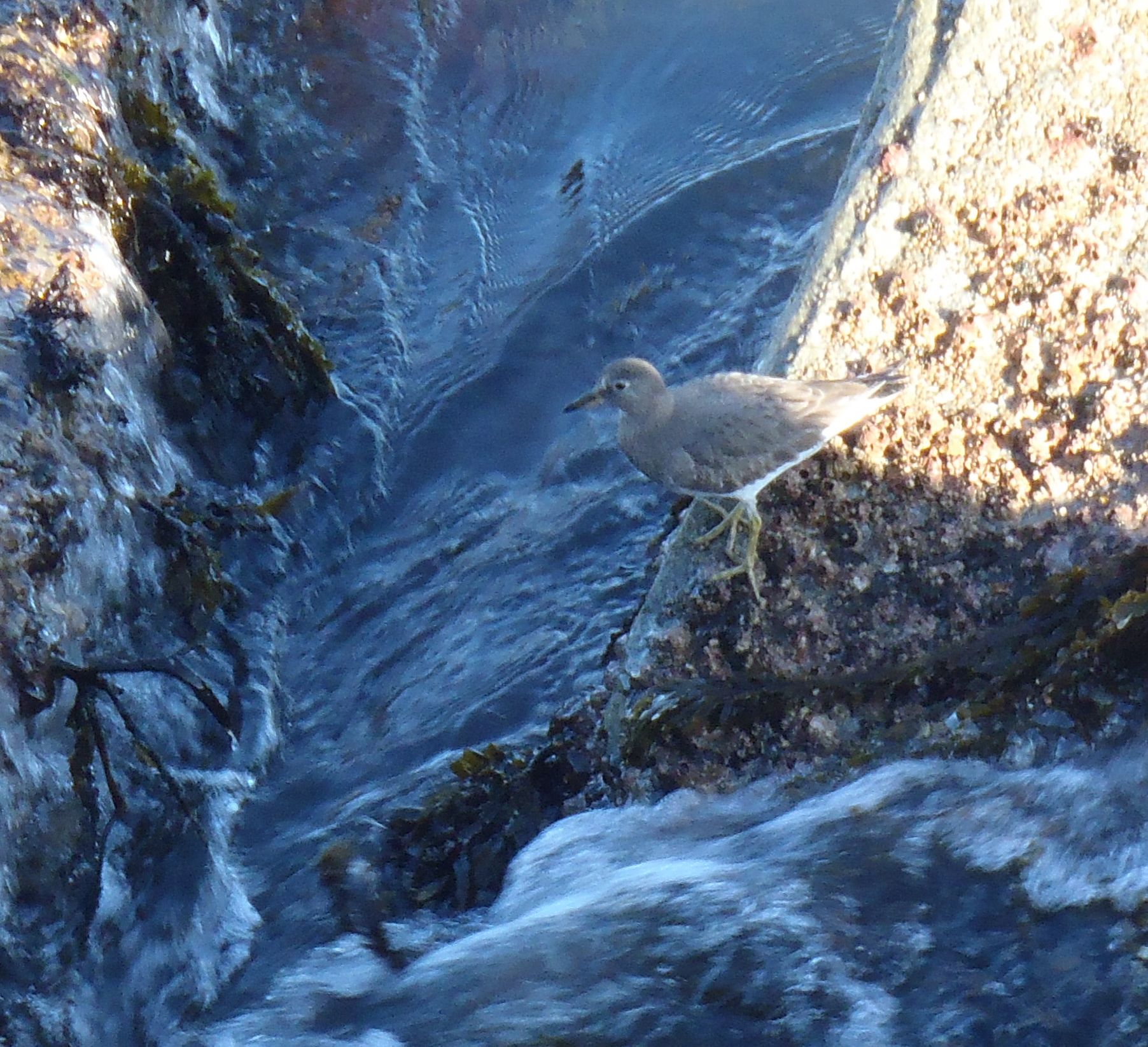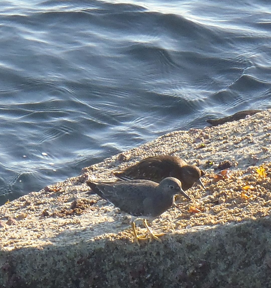 or watching rocks and one happens by, they’re hard to spot. I’ve seen them at the surfline on Monterey’s Coast Guard breakwater and along our rocky shores. They’re small, stocky gray birds (I know, non-descript) and easy to confuse with turnstones, which share the same space, however surfbirds have yellow legs.