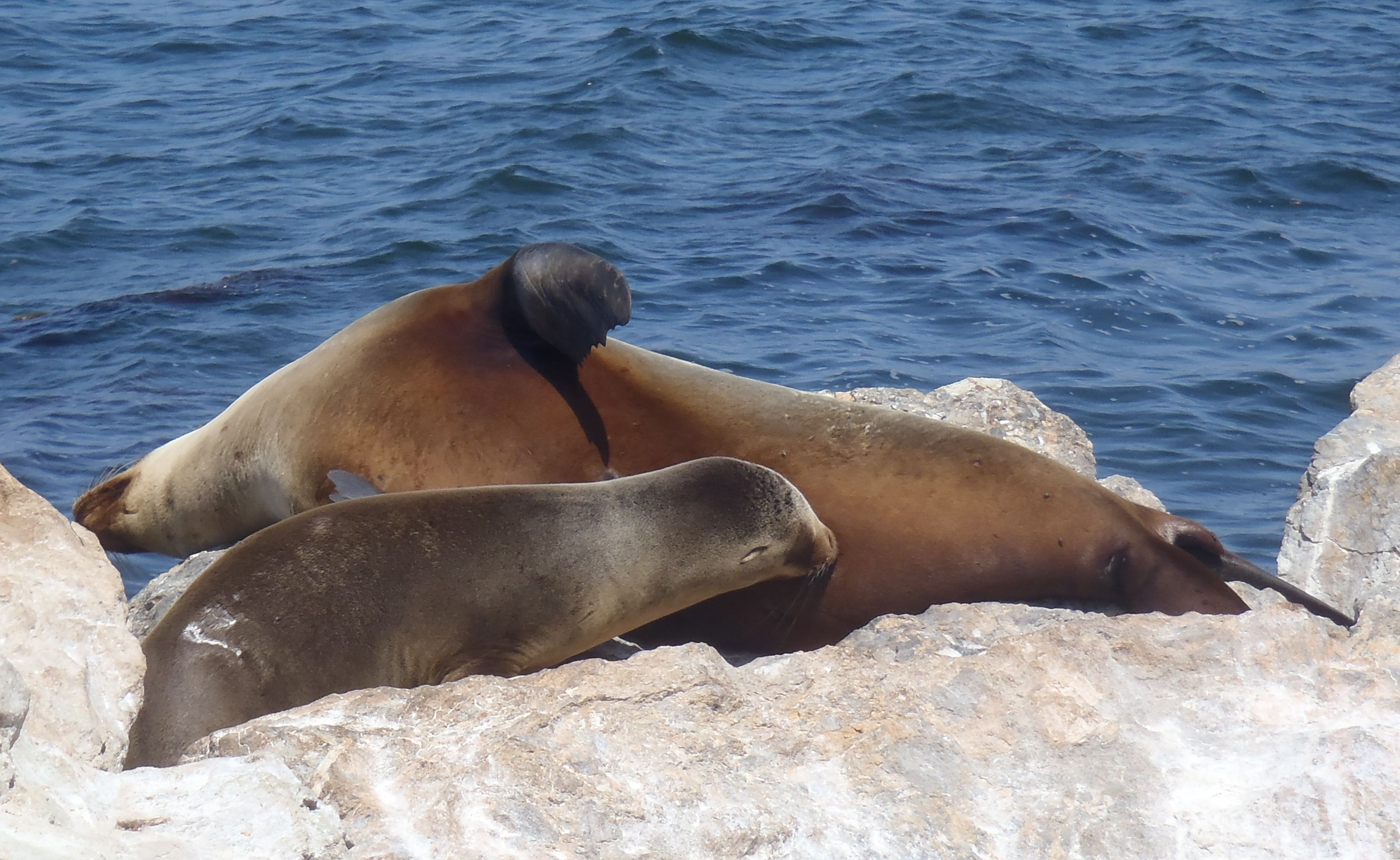 This afternoon while checking on the Brandt’s cormorants nesting on the breakwater, I heard a wailing plea. On the ocean side of the rocks near the cormorants’ nests was a crying sea lion pup. I caught pictures of it nursing while its mom was snoozing. This is unusual because we see mostly male sea lions in Monterey Bay. Females give birth and raise pups this time of year normally on offshore islands. But this has been an unusual year for sea lions, especially last year’s pups that are now yearlings struggling to survive. This sighting was definitely an unexpected one for me. I hope it doesn’t mean that we’ll be seeing more pups here this year.