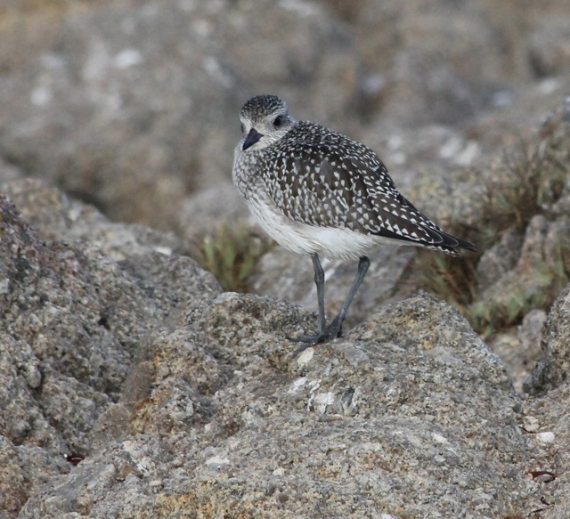 This lovely black-bellied plover (Pluvialis squatarola) was with a larger group on the rocks at Asilomar State Beach, one of my favorite spots for walking and birding. It’s a new bird species for me! (Thanks to local birding expert Brian Weed for confirming the ID.) Our rocky shores are a migratory stop (the birds travel at night) from Arctic tundra breeding grounds to warmer wintering grounds. Individuals away from the group are usually seeking food. Although black-bellied plovers are protected by the Migratory Bird Act (and other treaties) and populations appear to be healthy, their reliance on Arctic tundra means that they’re vulnerable to climate changes.