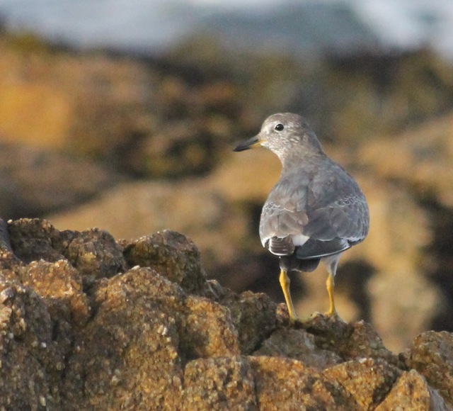 My other successful shot was of a surfbird (Aphriza virgata). These small birds are fairly common here (I see them on nearly every rocky shore walk) even though they’re migratory. If you look closely at the rocks near the water’s edge and wait patiently, you’ll find surfbirds along with the black turnstones they hang out with. The surfbirds’ yellow legs make them easy to distinguish from the black turnstones. There’s some conservation concern about surfbirds (which I didn’t realize till I wrote this). They’re livelihood is closely tied to rocky shores and so oil spills are a serious threat. In addition, human development along our coast impacts their ability to feed and rest undisturbed. We both like the same places.