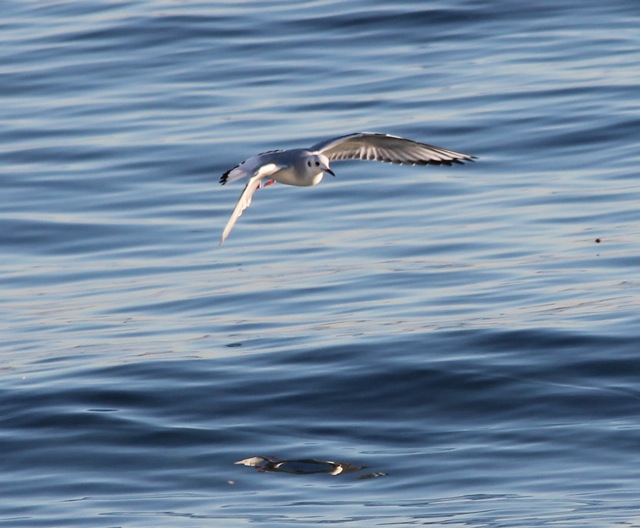 Bonaparte’s gulls are more like terns than gulls — they’re small for a gull, delicate and acrobatic in flight. They’re also easy to photograph as the glide, dip and dive for fish along the shore’s shallows and lagoons. These gulls are not in breeding plumage this time of year (no black head), but you can tell young ones (in the photo) from adults. The immature birds have black all along the wing tips and black along the backside of the wings. Bonaparte’s will winter here until their summer breeding grounds across Alaska and northern Canada warm up.