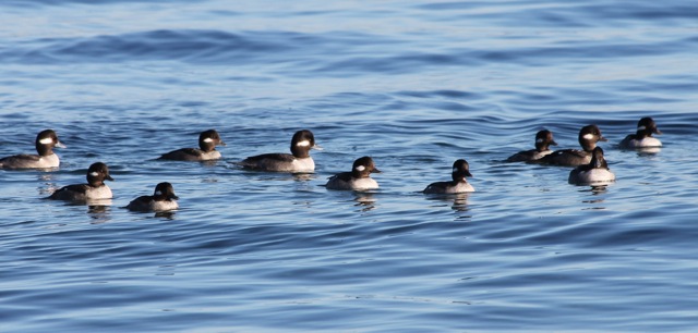 A second new species for me was the greater scaup, also a wintering visitor from the north. This group had the sun at their backs and so were challenging to identify and photograph. (And, honestly, after a while, so many ducks on blue water all started to look alike.) The scaup had white around the base of the bill and looked more duckish than others.