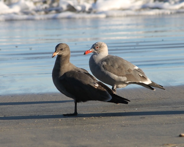 The single gull (in the photo above) is an adult Heermann’s in breeding plumage. The duo (photo to the right) includes two Heermann’s: a second-year bird (the closer) and a third-year bird (the farther). Soon these gulls (at least the adults) will be heading south to breeding grounds in Baja and Mexico.