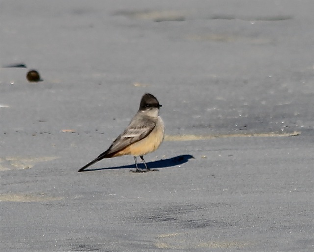 Along the beach among the gulls were two phoebes: a black phoebe and a Say’s phoebe. The black phoebe (left photo) is fairly common along the coast year-round. I often see them bouncing from fence post to post or kelp pile to pile in search of insect meals. Kelp flies are in abundance and might be what they seek.