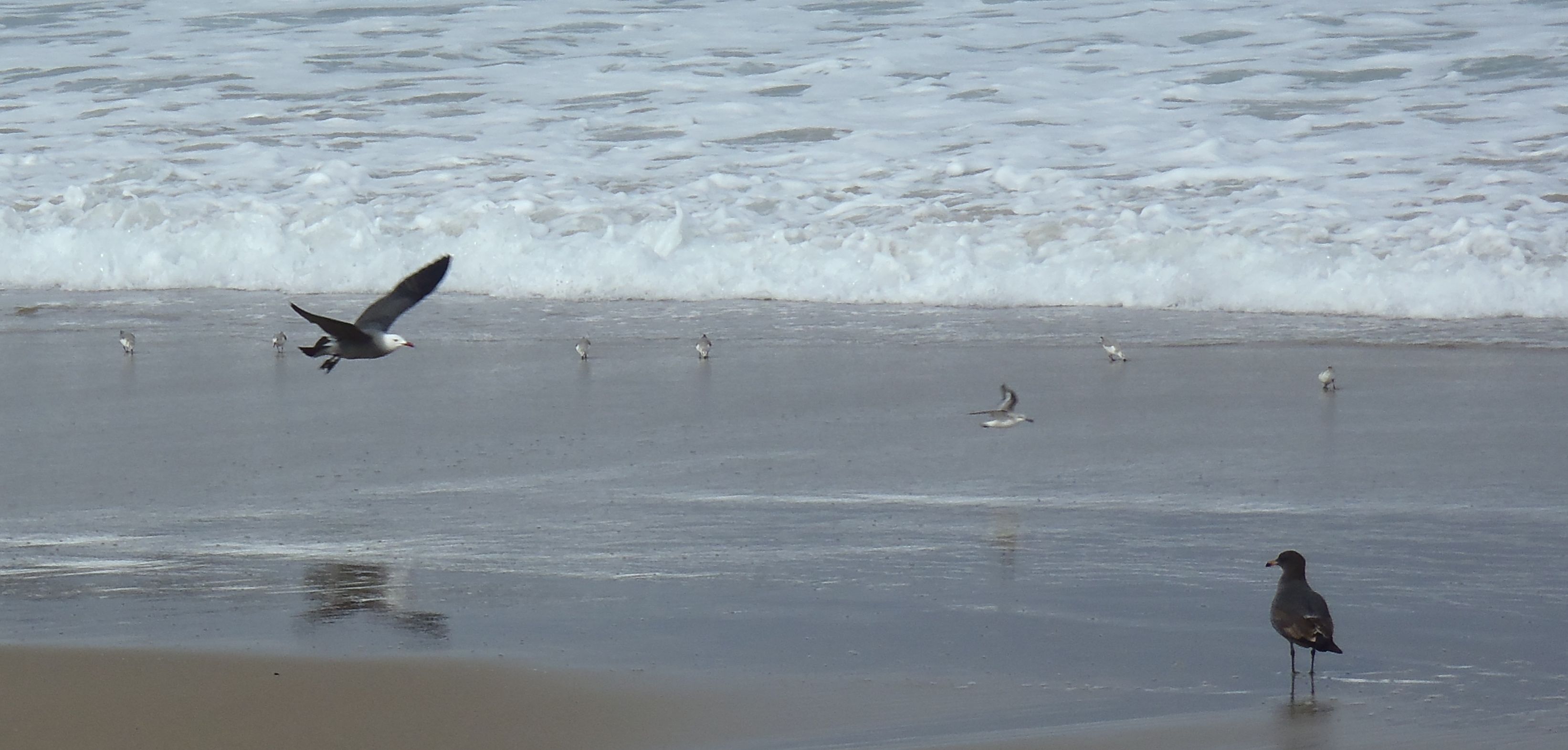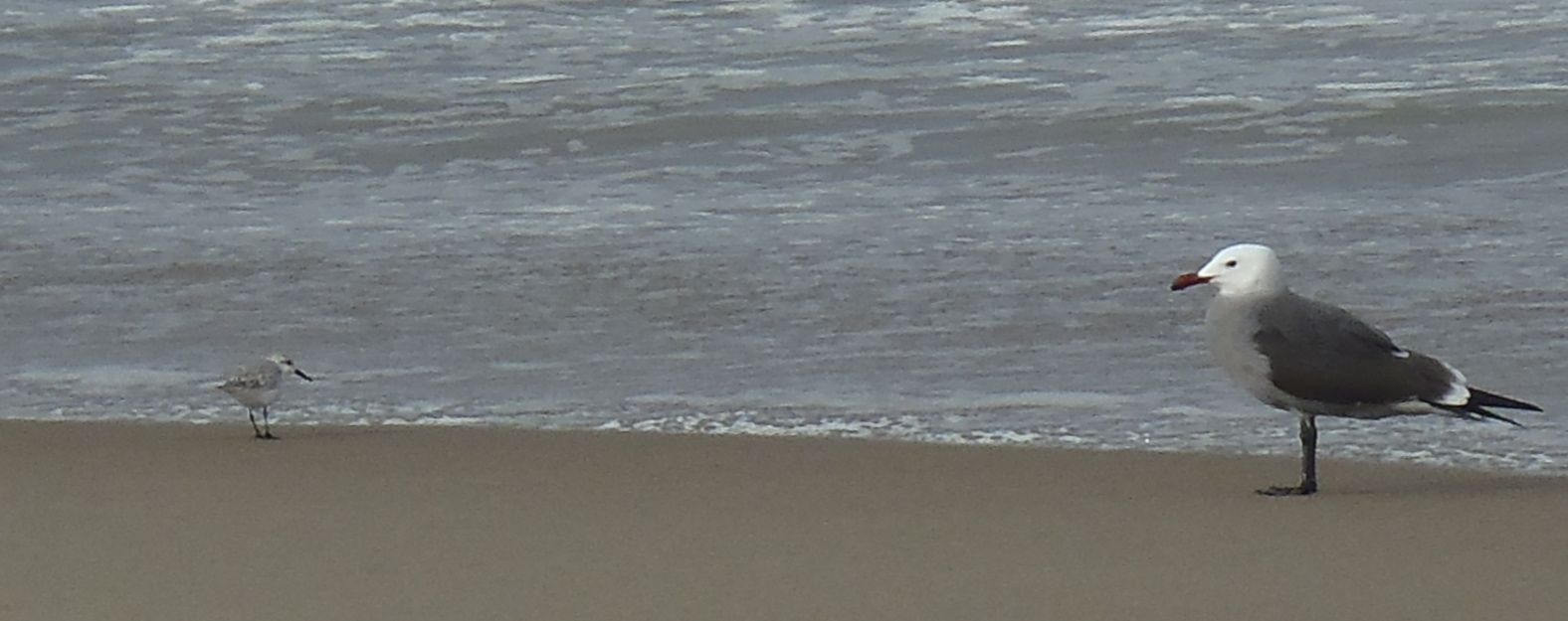 Yesterday I took a long beach walk as a storm threatened, and witnessed a surprising sanderling (Calidris alba) and Heermann’s gull (Larus heermanni) interaction.