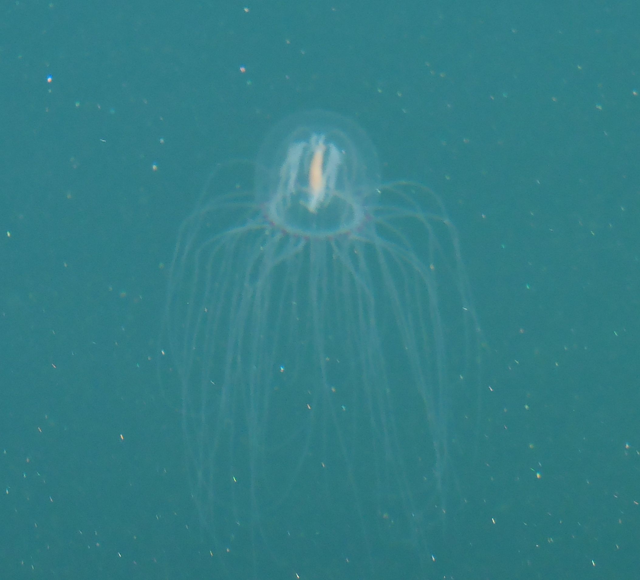 Floating past me were tiny, delicate, transparent animals called bell jellies (Polyorchis sp.). I’ve since learned that bell jellies live along our coast in bays and harbors near the bottom where they use their many tentacles to sting and capture crustaceans (shrimps, etc.). How something so delicate-looking can survive in the ocean is amazing.