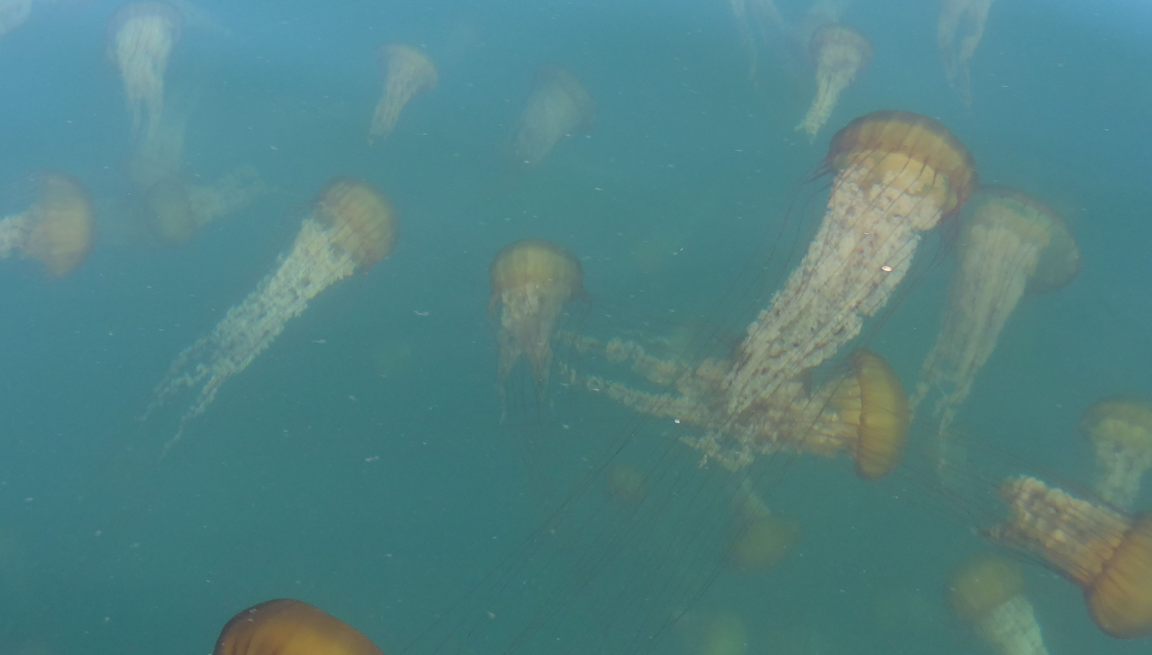 a swarm of hundreds, maybe thousands, of sea nettles (Chrysaora sp.). The pulsating large and small golden-brown animals stretched from the end of Wharf 2 (the commercial wharf) across the open mouth of the harbor to around both sides of the breakwater.