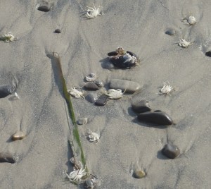 I haven’t seen young Dungeness crabs along this stretch of beach since that summer. Populations of crab larvae naturally fluctuate with sea surface temperature, correlated to the Pacific Decadal Oscillation. Dungeness crabs prefer cooler waters and the lack of beached crabs recently could be related to a warm-water El Niño and the blob off our coast. Another explanation for the excess crabs on this particular beach that year could have been beach nourishment. [During the winter of 2012 – 2013, approximately 7,500 m³ of Monterey Harbor dredge material was used to nourish this critical south Monterey Bay erosion area, according to a Currents 2013 poster by A. Snyder et al.] Who knows for sure?