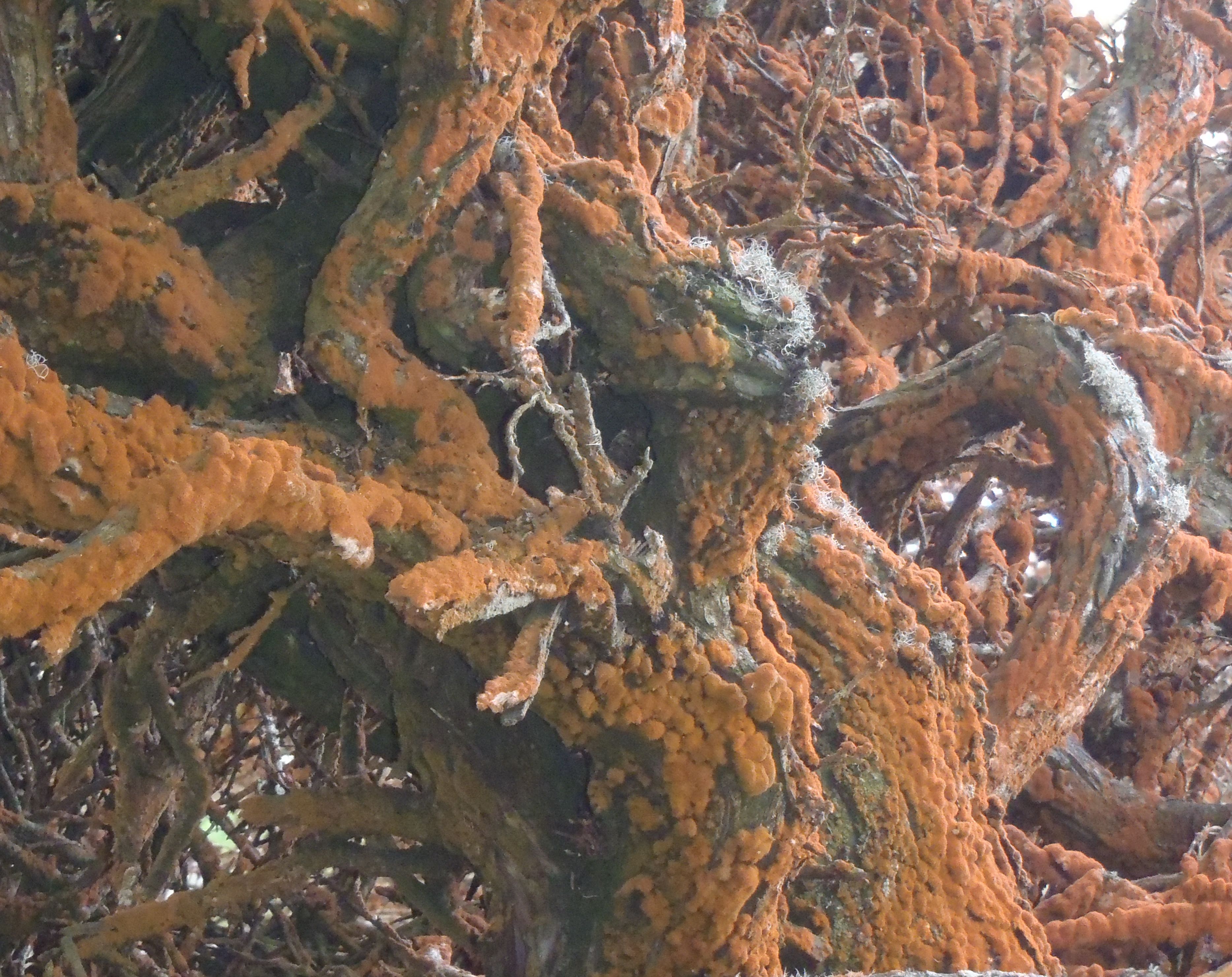 I was surprised when I learned that the orange fuzz is a green alga. It is rust orange instead of chlorophyll green because of beta carotene (which gives carrots their color) and other carotenoids. One study (Mukherjee et al. 2010) found that the total carotenoid concentration is higher in winter (hence a brighter color) than in summer. This alga (Trentepohlia aurea var. polycarpa) is an epiphyte, that is, it uses cypress trees (Cupressus macrocarpa) only as a growing surface and causes no harm, unlike a parasite. From my reading, it appears the species is found worldwide in damp places similar to Point Lobos, but the variety polycarpa is specific to our coast.