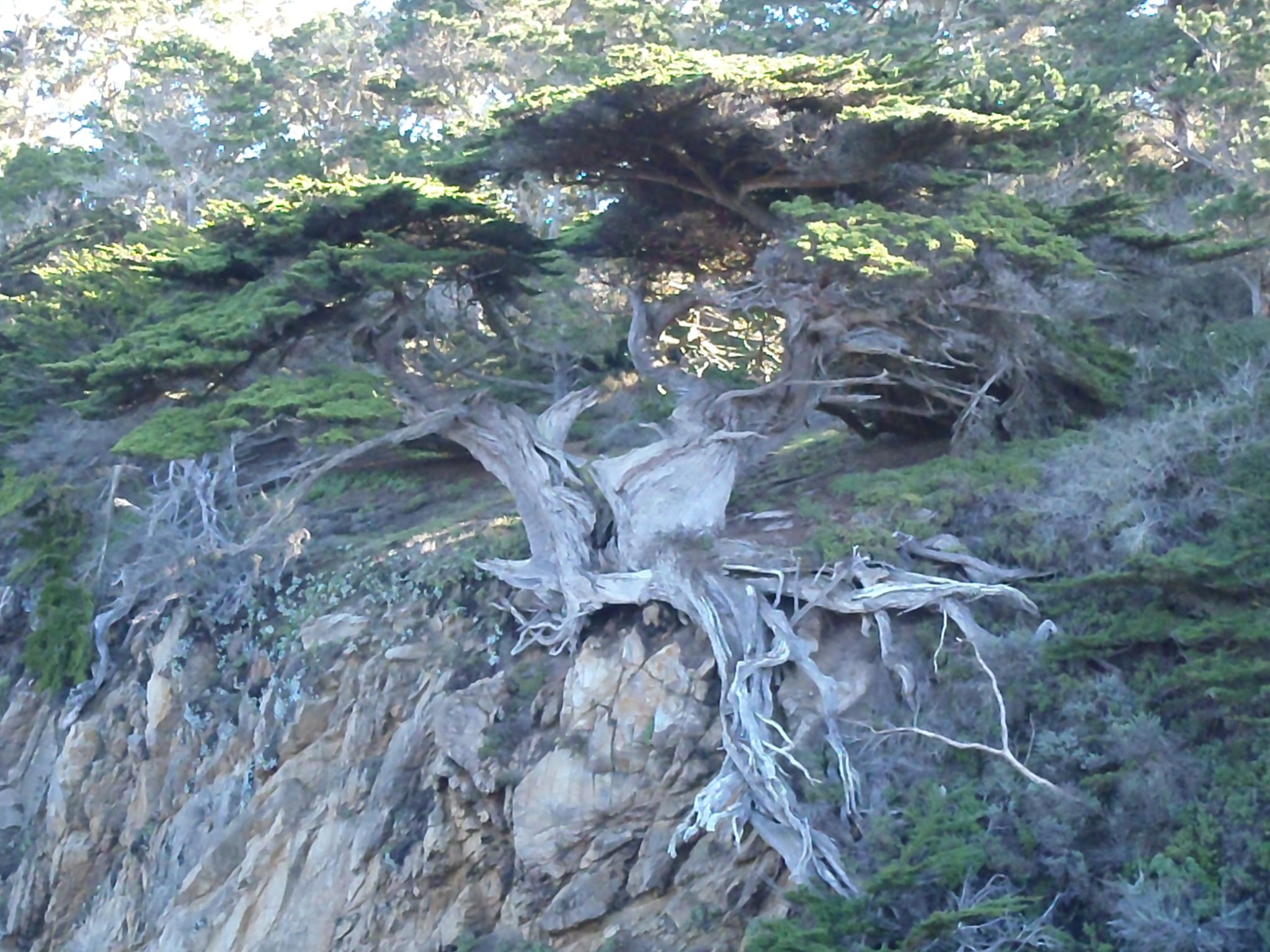 The spray of ocean saltwater and ceaseless buffeting by winds gnarl cypress trees along the shoreline and some appear as forest characters.