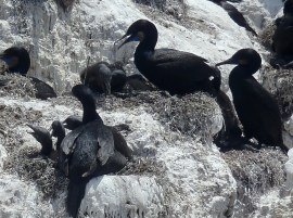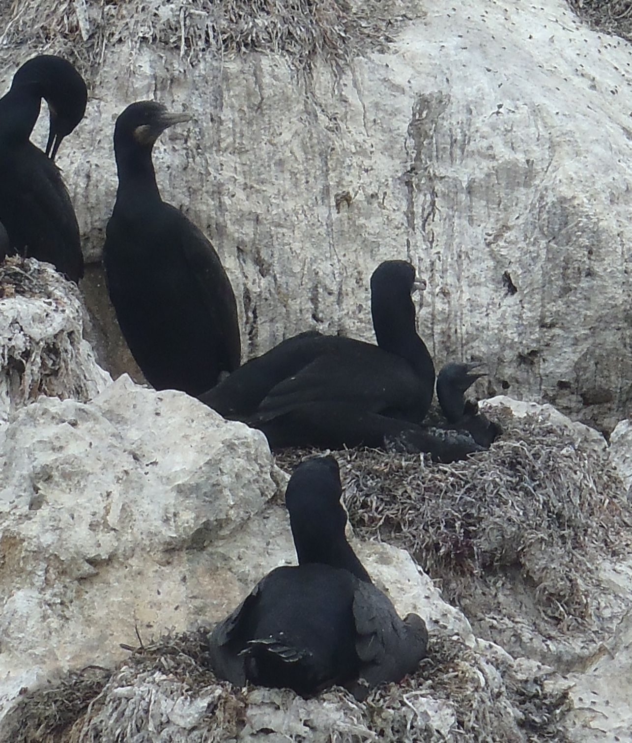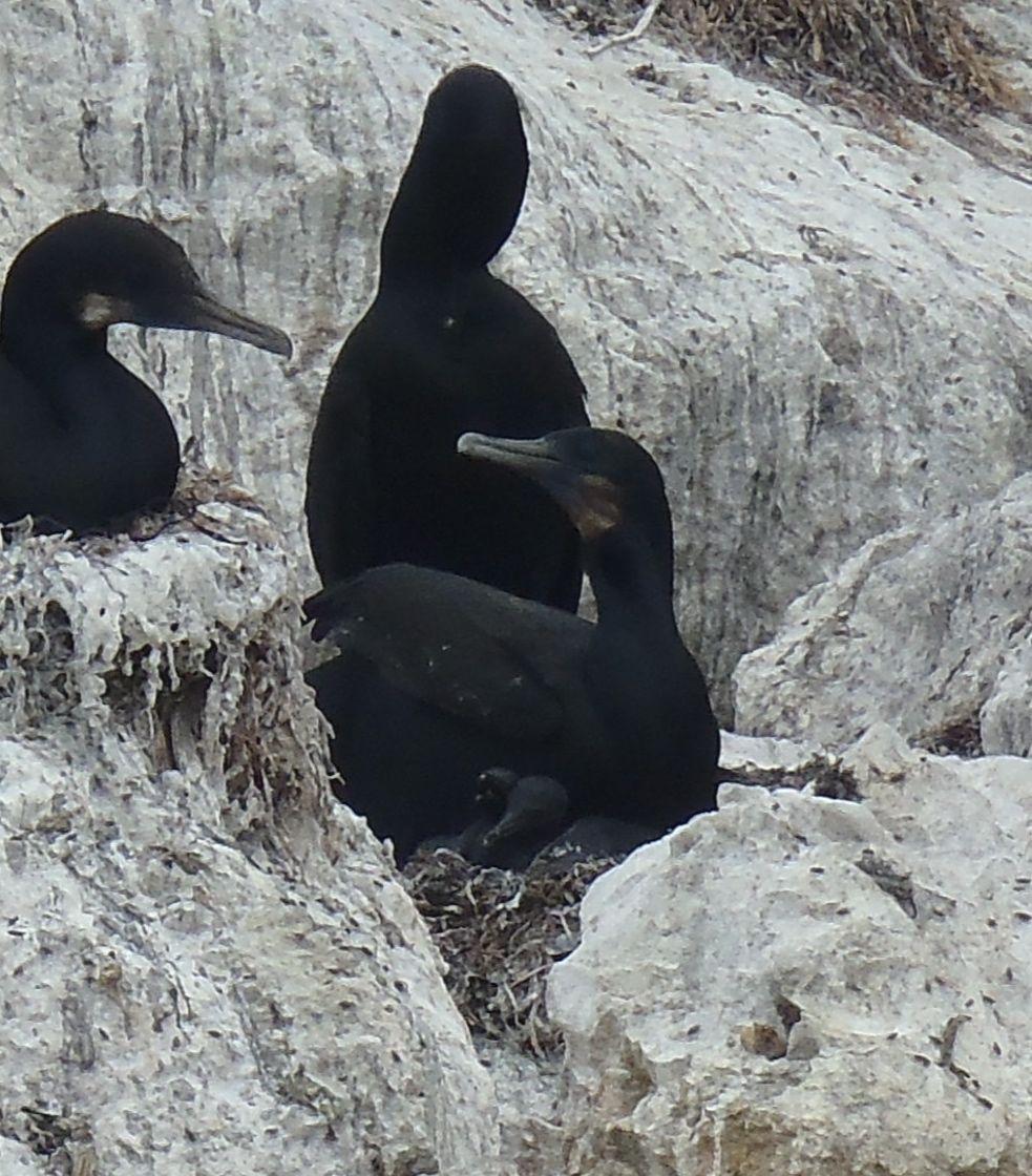 I started watching the Brandt’s cormorants on the breakwater in February when they evicted sea lions from the upper rocks. In April and May they worked ceaselessly building nests and tending them. I’ve watched the nest mounds grow, the rocks whiten and the sitting birds thin. This morning I spotted hatchlings.