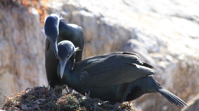 Now is the time when California sea lions and Brandt’s cormorants battle for control of the Monterey Breakwater. The breakwater is a favored hauling-out hangout for male sea lions during most of the year, but in the spring, Brandt’s cormorants gather for displaying, mating, nesting and rearing young (pelagic and double-crested cormorants choose more private rookery sites).