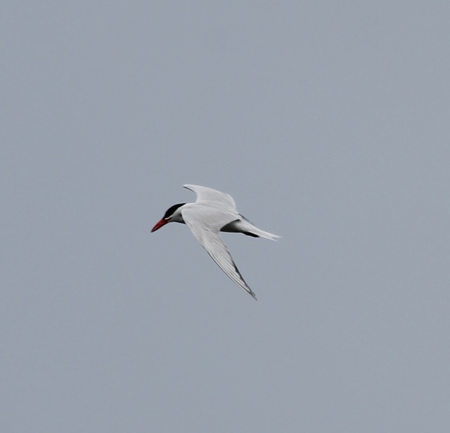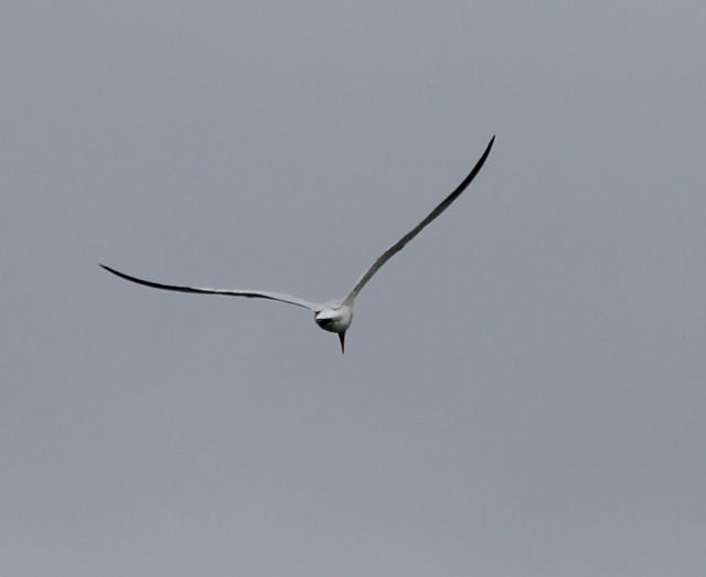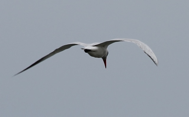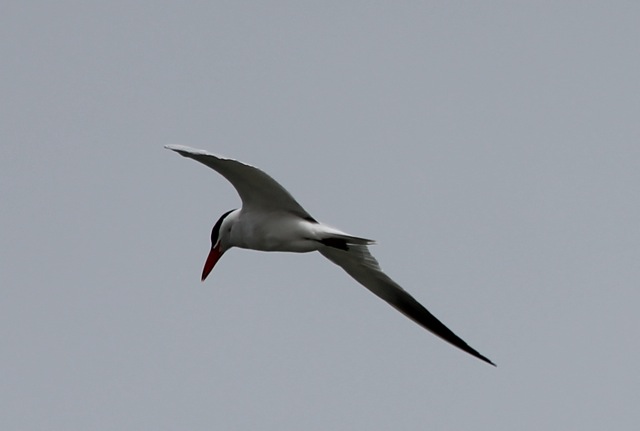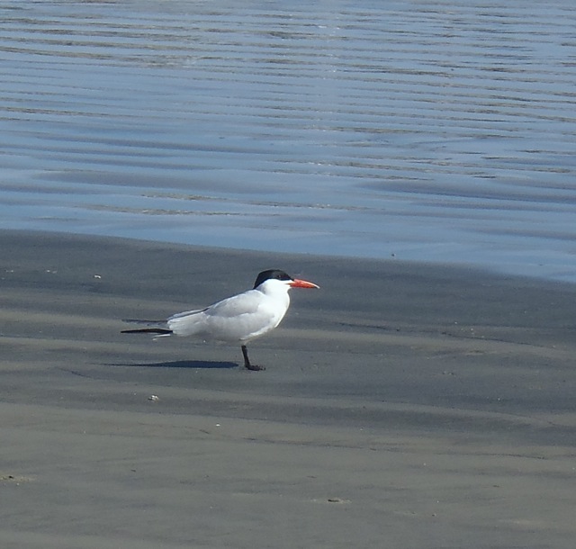 A Caspian tern (Sterna caspia) has been gracing Del Monte Beach for the past week or two. I typically see them around Monterey Bay this time of year. This is a stately bird, about the size of a gull, with a beautiful black cap, black legs and heavy orange bill. So far I’ve seen only the single bird and she/he has spent most of the time standing on the shore, taking flight only when people and dogs approach.