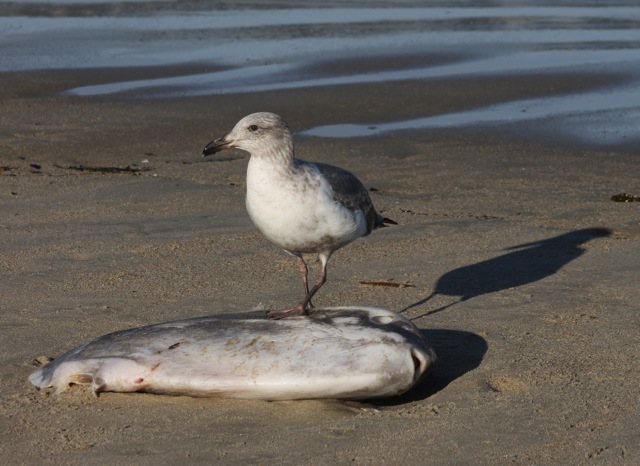 Gulls are responsible for removing the eyes. The beached sunfish are always young and about the size of a hubcap. The adults are much larger and likely too big or too tough for sea lions. In January I saw more sunfish than usual, and that also may be attributed to the winter’s warmer water.