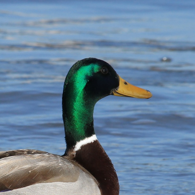 Just to practice I photographed this male mallard as he walked by me up the beach toward the sun. Mallard shots are easy to get so I wasn’t expecting anything special. To my surprise and delight, I got a stunning example of the structural color of feathers.