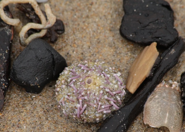 A signal that there’s something interesting on the beach are the turkey vultures (Cathartes aura). I grew up calling them buzzards and have always been fascinated. Sometimes I see them overhead, but I usually find them working on whatever has landed on the sand. Even though I’m walking only a few hundred yards from a major road, the sight of them always transports me to another age when large vultures were as common on beaches as joggers and dog walkers today.