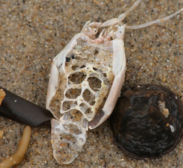 Dead crabs and crab carapaces (shells) are very common, especially during the summer. To grow, crabs molt (shed the old shell) and this litter traces the tideline. Most of the crabs are less than an inch (2.5 cm) in size. This sheep crab (Loxorhynchus grandis) was the exception at nearly a foot (30 cm) across. This was a rare sighting — I’ve only seen one like this so far. I was sure it was dead, but too chicken to test if it was the whole crab or only the carapace encrusted with barnacles.