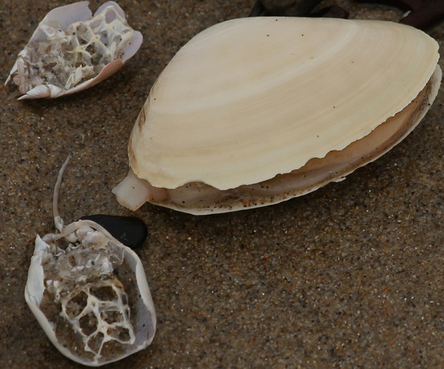 A common sight every year, usually in the fall, are dead ocean sunfish (Mola mola). These fish are without fins and eyes. They’ve been victims of a tough frisbee game — a sea lion grabs a fin and throws the sunfish to tear it off (presumably to eat). Without fins, the fish are unable to swim, get caught in currents and tossed onto the beach.
