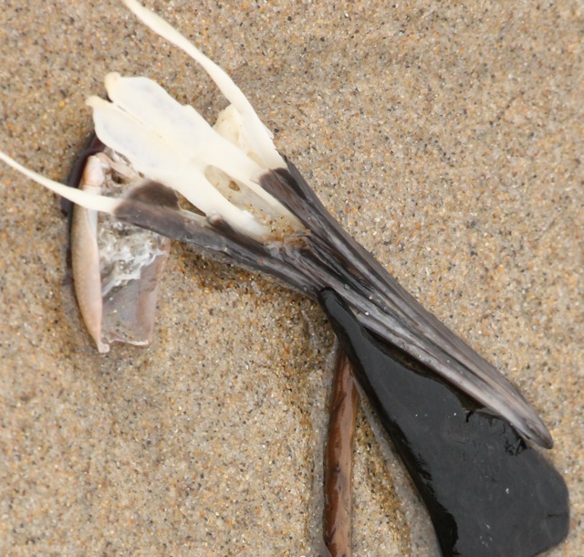 This last animal was a very unusual sighting — a thresher shark on my beach. I couldn’t believe it. The gulls and vultures were enthusiastic, too. I’m not sure of the species: a common thresher or pelagic thresher (Alopias sp.). The fish was intact and had no bite marks or other open wounds on it, but it was, as you can see, bruised and bloody. If I were to guess at the cause of death, I’d say that it was caught, and died in the net or after it was released. I don’t know what else would cause those bruises. It’s a beautiful animal (as are all of these, especially when alive in the water). I’m sad they died, but glad they ended up on my beach, making my walks more interesting and enlightening me to what lives in the bay, while worrying me about how our ocean is changing.