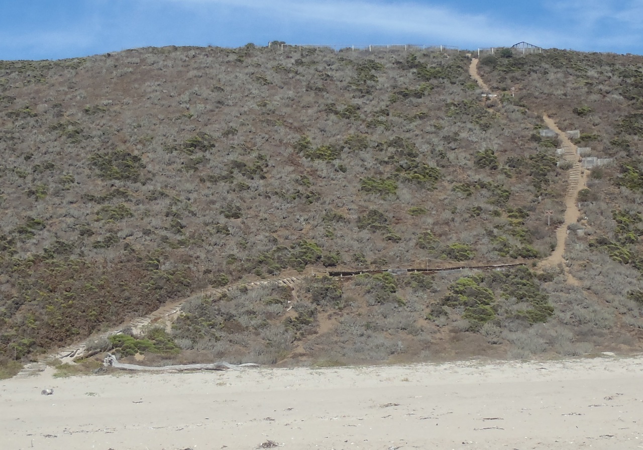 All I have to say about this trail is that I’m glad I’ve never had to use it. It snakes up the dune from the beach and goes I know not where. It looks like a tough climb, especially after having walked 7+ miles (11+ km). This year the path was a welcome sight, though, because I had only a mile or two (2 to 3 km) to go. I stopped and ate my M&Ms (an afternoon treat).