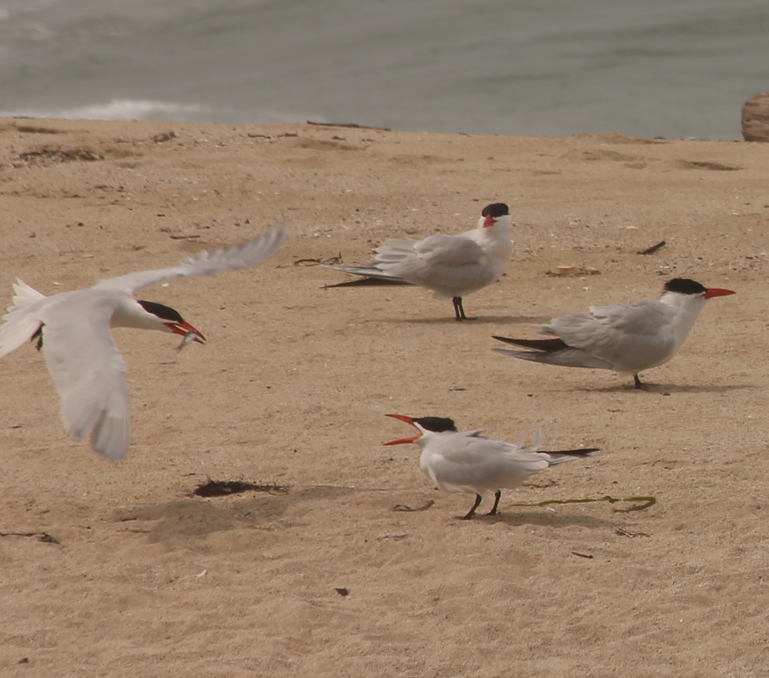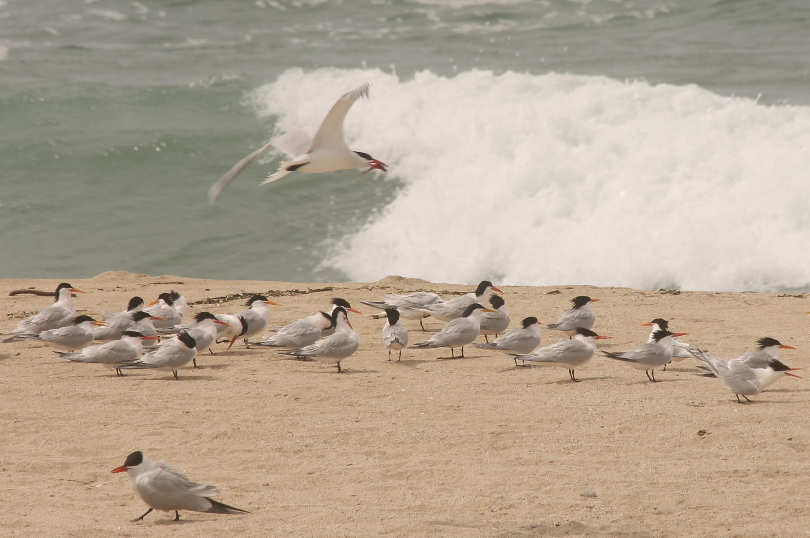 Column 1: Snowy Plover + Sanderlings, Snowy Plover, Caspian Tern, Caspian Tern, Elegant Tern (flying)