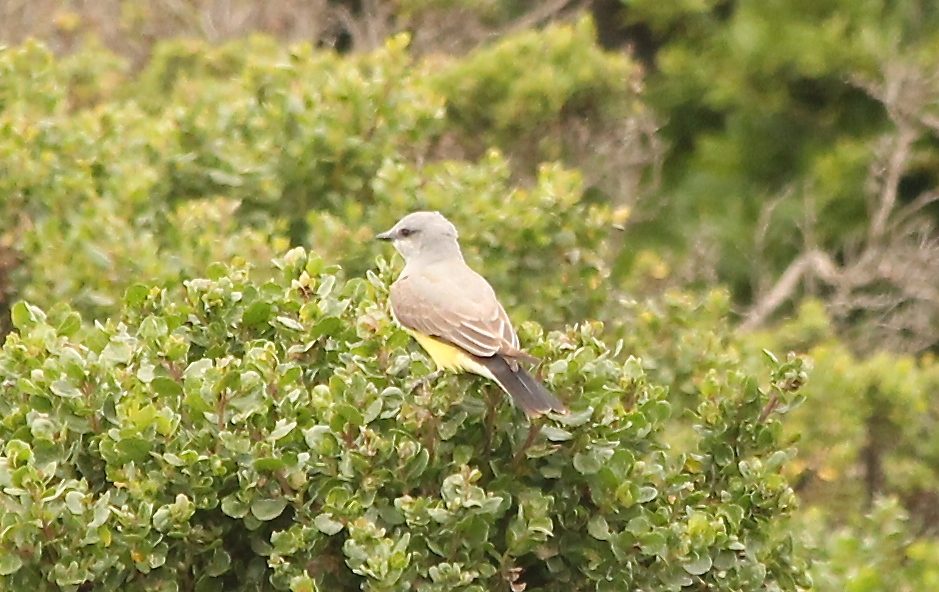 According to Alvaro Jaramillo’s Field Guide to the Birds of California, this bird is a migrant here for the spring through summer breeding season. The Sibley Field Guide to Birds of Western North America says this kingbird is seen singly or in small family groups. We watched three to five together in the coastal scrub. It’s a beautiful visitor. I was happy to make its acquaintance.